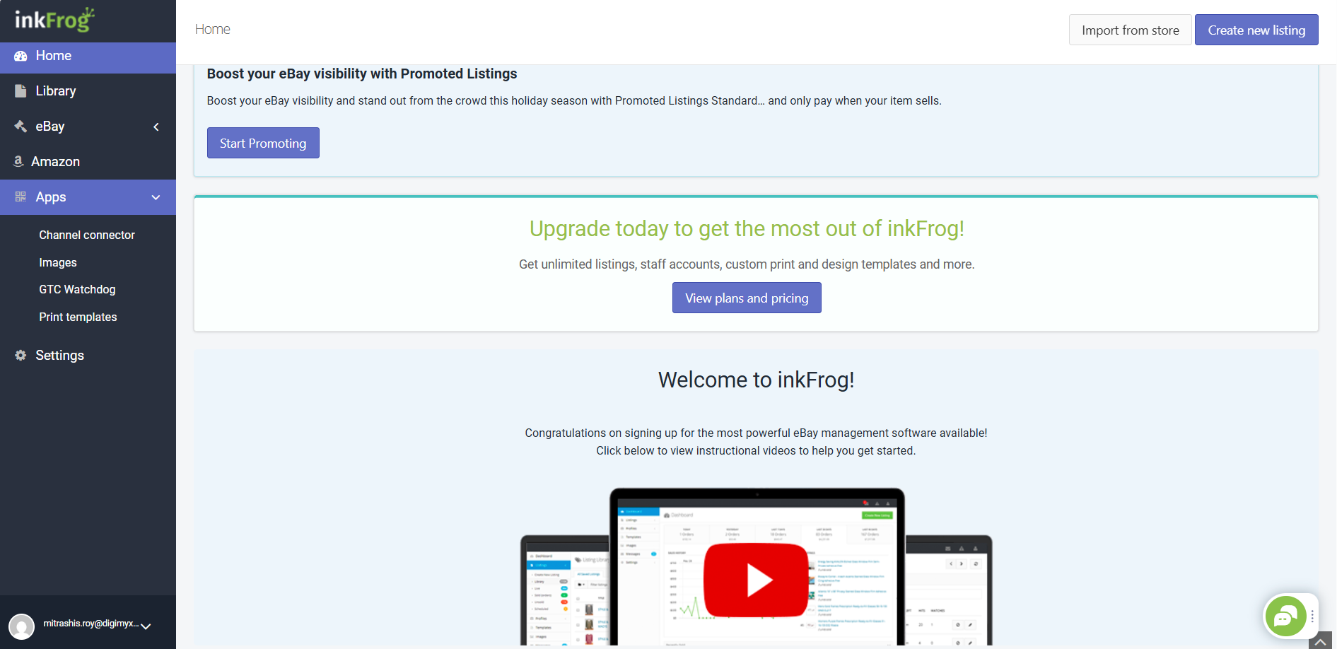 inkFrog provides e-commerce sellers who manage eBay or Amazon listings with a simple yet powerful dashboard. Below are the major sections and features of the dashboard:
