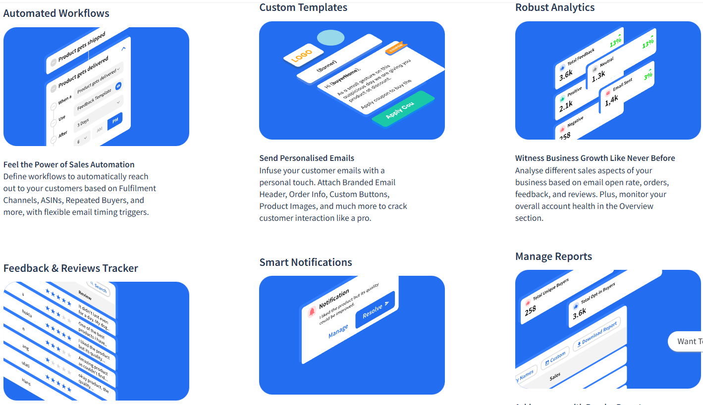 Salesla boasts a long list of features that make it a competitive Amazon feedback tool for sure. From automated workflows and custom templates to robust analytics and review trackers, Salesla enables sellers to improve their feedback scores, optimize product listings, and ultimately boost sales. Below listed are their features: