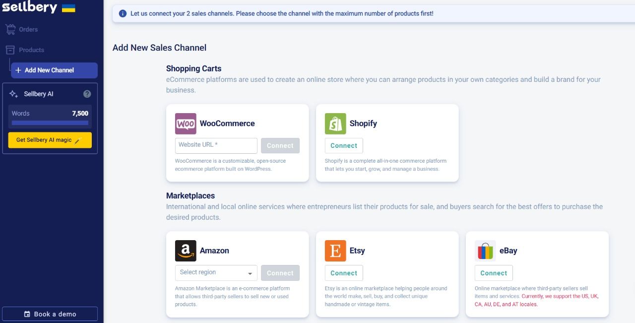 - New Channel - Adding a new sales channel is facilitated through this tool. The dashboard currently supports - Shopping Carts: WooCommerce and Shopify, enabling direct integration with these online stores, and Marketplaces: Amazon, Etsy, and eBay to list and manage products on these e-commerce platforms.