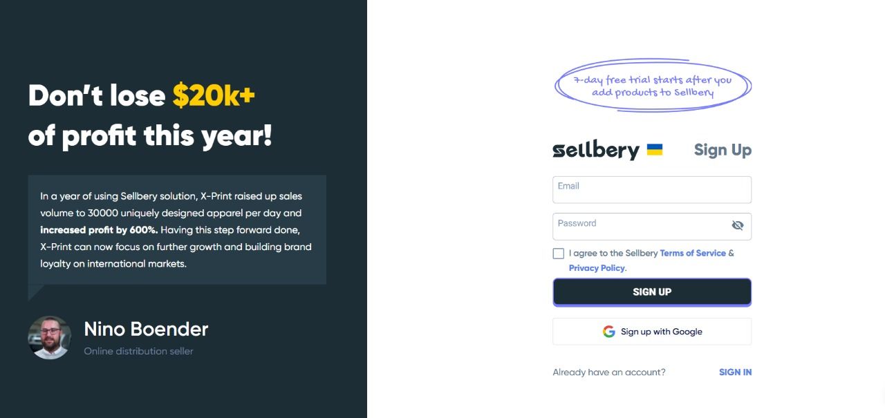- Visit the site - Navigate to their official website and click on “Get Started Free.” Just for your information, Sellberry’s website is one of the most interactive and visually appealing sites you will come across.